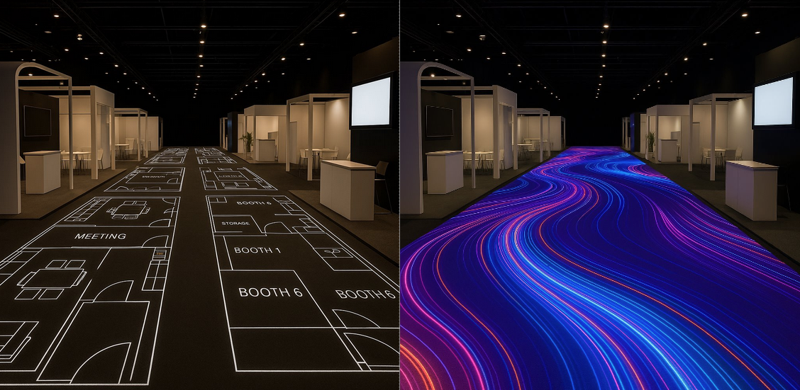 Plans are projected in exhibitions to outline booth spaces and help build up. The projection can be later used for animations, lightning and entertainment purposes.&#x20;